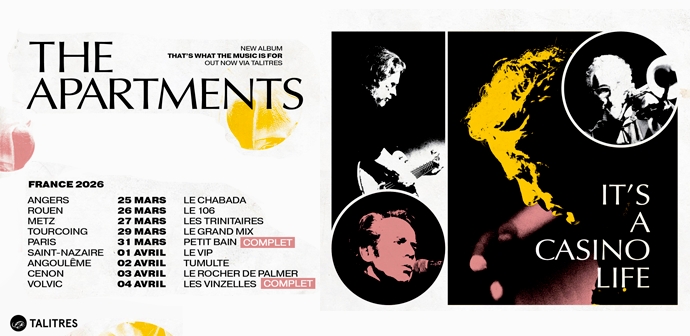The Apartments en tournée française dès cette semaine. Sur scène P.M Walsh sera accompagné de Tim Kevin (claviers, guitare, chant) et de Jeff Crawley (trompette, percussions) : les amateurs de musique habitée reconnaîtront là une occasion rare de retrouver un groupe devenu, au fil du temps, une véritable référence de la scène indépendante.